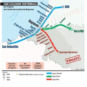 Projet qui prévoit, à l’horizon 2032, le passage d’un train toutes les 30 minutes entre Dax et Irún (puis jusqu’à Saint-Sébastien). La feuille de route actuelle de la Région envisage l’ajout d’une halte à Tarnos et d’une autre à Bidart. « On souhaite qu’Urrugne, qui est la 6e ville du Pays basque (en termes de population, NDLR) et qui compte plus d’habitants que Bidart ou Guéthary, qui sont desservis, dispose aussi de sa halte », assure la candidate.